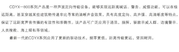 ? ? ? ▼動亂、暴亂、騷亂現(xiàn)場,暴徒喪心病狂,受蠱惑的群眾也可能情緒失控,警察法規(guī)說教不可能動搖其心理防線,動槍動棒恐傷無辜,釋放催淚瓦斯又有失人道,而“聲霸”精準(zhǔn)瞄準(zhǔn)其骨干分子,高分貝施壓,使起聽覺神經(jīng)無力招架,被迫撤離,既能有效控制局面,平息大亂,又不致命、致傷、致殘,彰顯文明執(zhí)法。